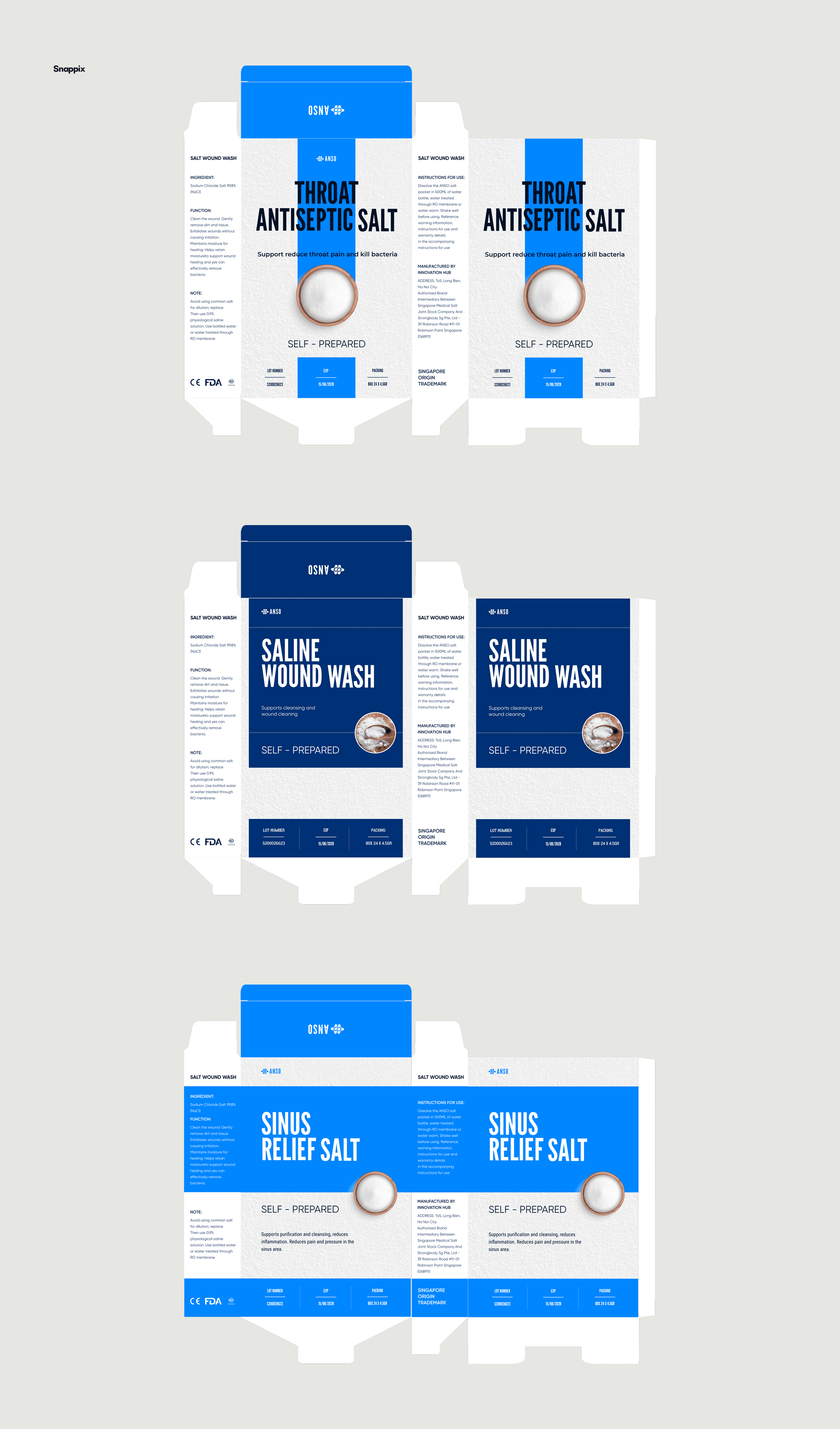 This project presents a packaging design system for ANSO medical salt products, including three variations: Sinus Relief Salt, Saline Wound Wash, and Throat Antiseptic Salt. The design focuses on creating a clean and professional visual identity that communicates purity, safety, and medical reliability, while maintaining a modern and minimal aesthetic.